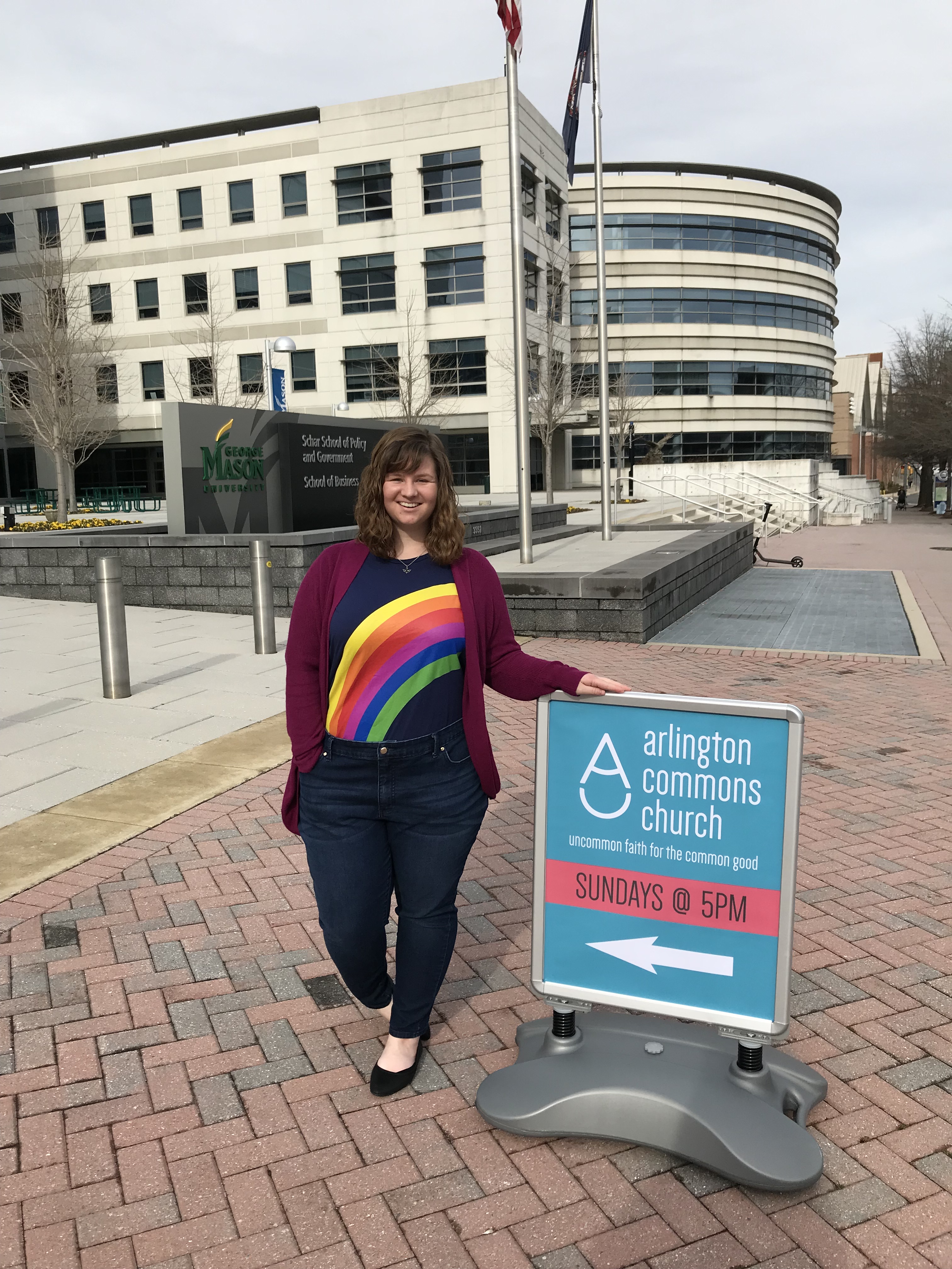 Greeting people before the Arlington Commons worship service on March 10, 2019